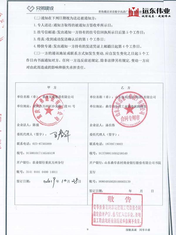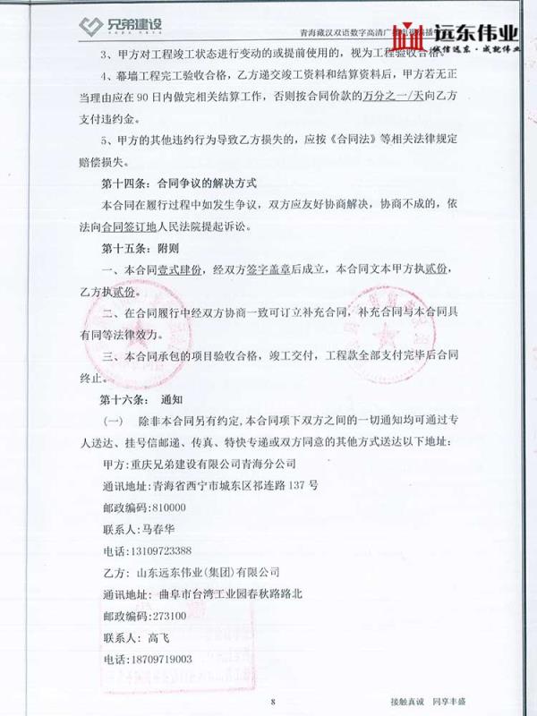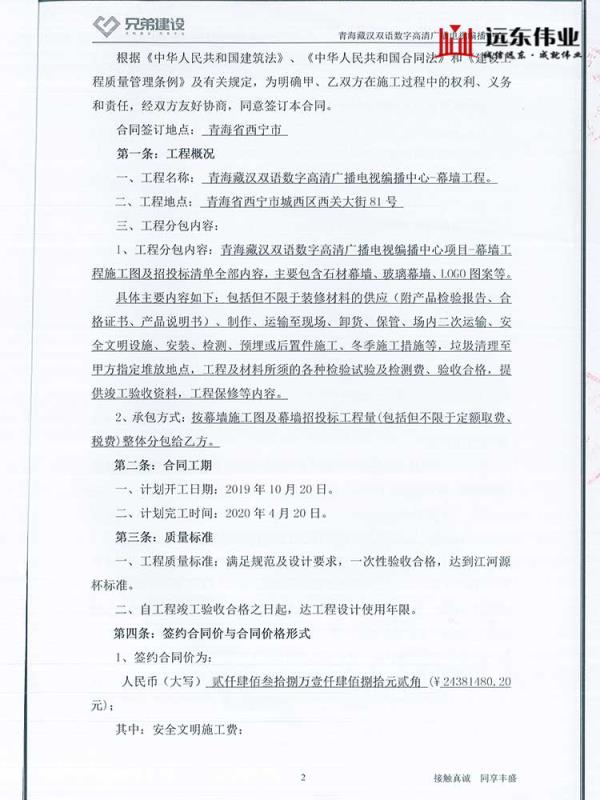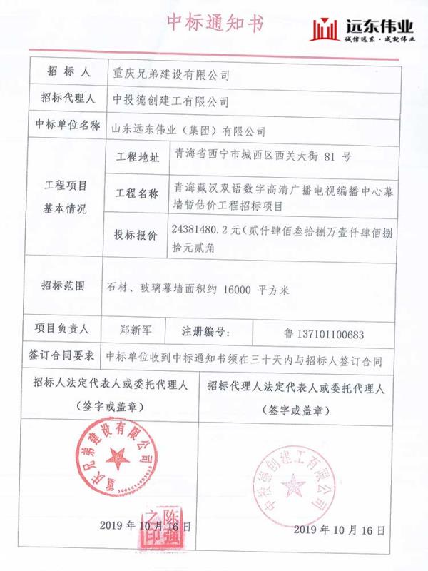 青海藏漢雙語數(shù)字高清廣播電視編播中心幕墻工程、中標(biāo)通知書(鄭新軍)
