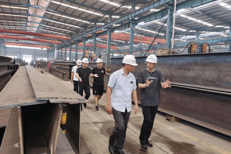 隨后,公司領(lǐng)導陪同考察組成員去往鋼結(jié)構(gòu)加工車間、網(wǎng)架加工車間、管桁架加工車間進行實地考察,考察期間由公司領(lǐng)導詳細介紹了公司產(chǎn)品的型號、性能及特點并與考察組成員進行了討論交流。公司始終視質(zhì)量為生命,始終堅持“質(zhì)量保障、信譽至上”的原則,嚴格貫徹ISO9001:2000質(zhì)量管理體系標準,并取得了認證,創(chuàng)造了許多高品質(zhì)工程,近年來,先后完成多項國家重要工程項目,其產(chǎn)品的質(zhì)量受到廣大用戶的一致好評。山東高速集團領(lǐng)導在實地考察后對于我公司的實力也給予高度肯定。